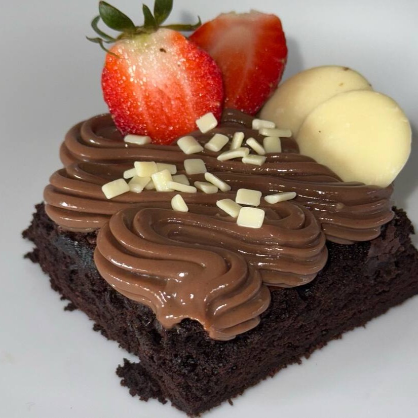 Brownie macio e chocolatudo, coberto com brigadeiro cremoso, dois pedaços de chocolate branco, morangos frescos e finalizado com granulado branco para um toque especial
