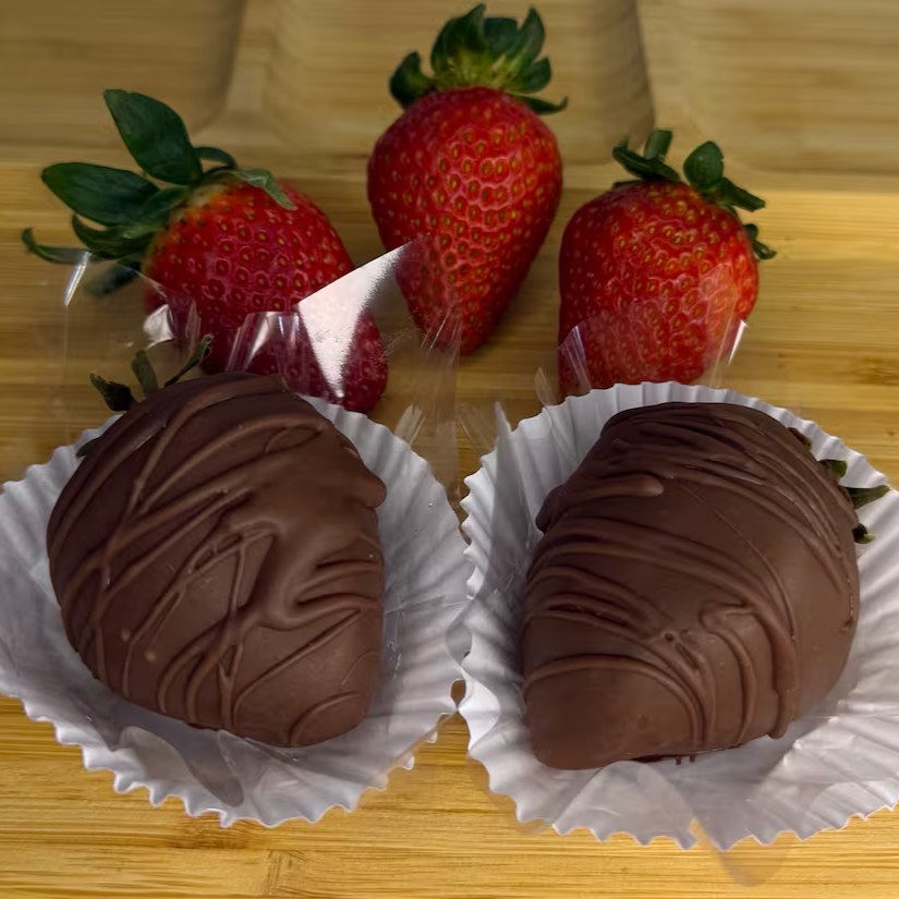 Dois moranguinhos com recheio de chocolate Ninho cobertos com calda de chocolate nobre. Pequeno no tamanho, gigante no sabor! Ideal para matar a vontade, experimentar e dividir com aquela pessoa querida!