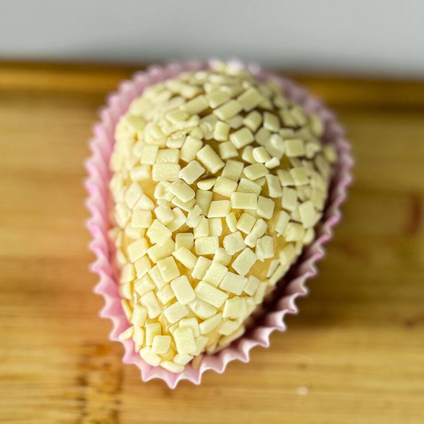 A irresistível coxinha doce com um morango fresquinho envolto em brigadeiro branco cremoso, finalizado com uma camada generosa de granulado. Uma explosão de sabor que conquista no primeiro mordida!
