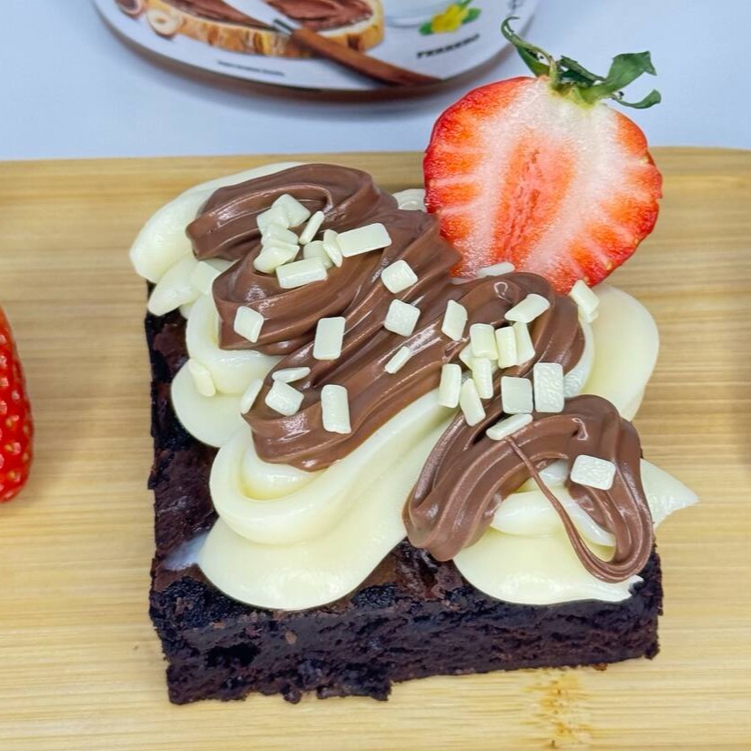 Brownie macio e chocolatudo, coberto com Ninho e Nutella, morangos frescos e finalizado com granulado branco para um toque especial