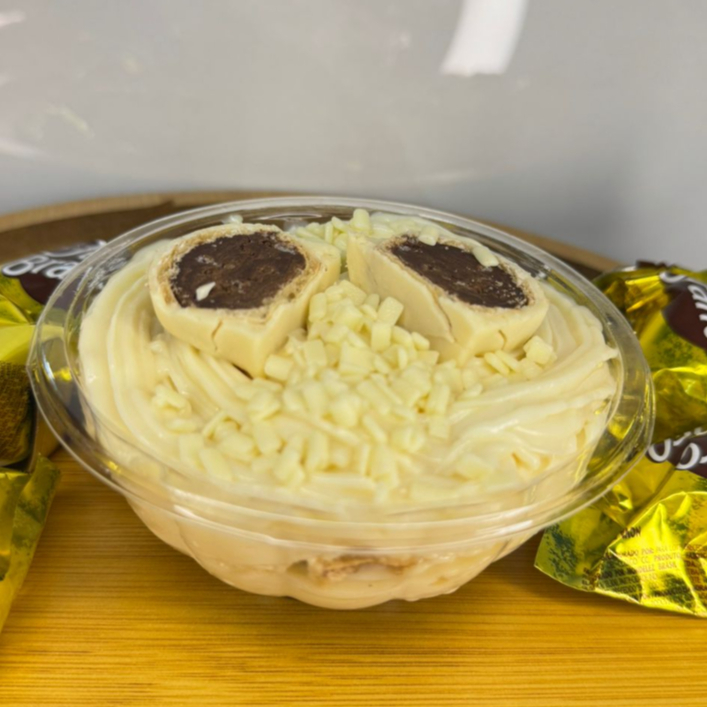 Uma explosão de sabores em cada colherada! Feito com creme de Ninho super cremoso, brigadeiro cremoso e intenso e bombom ouro branco que completa a experiência. Uma sobremesa perfeita para quem ama doçura na medida certa, e muito sabor. Ideal para compartilhar… ou saborear todinho sozinho!