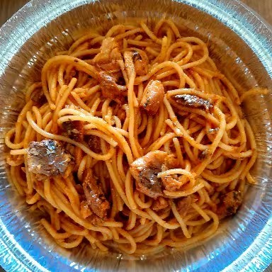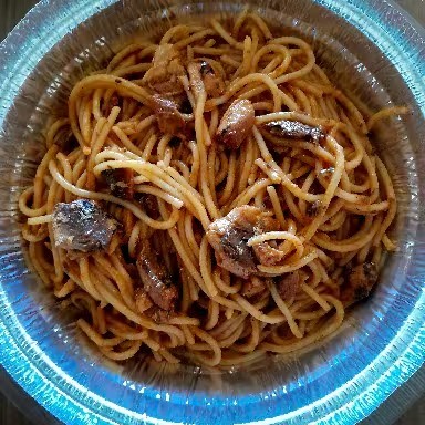 Macarrão tipo espaguete,molho de tomate e sardinhas.