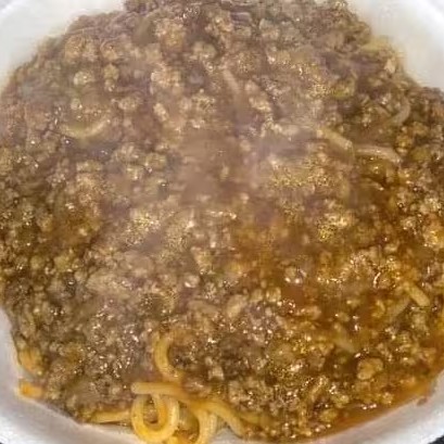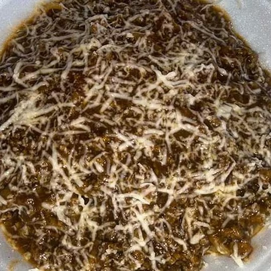 Macarrão tipo espaguete ao molho de tomate,carne moída e mussarela.