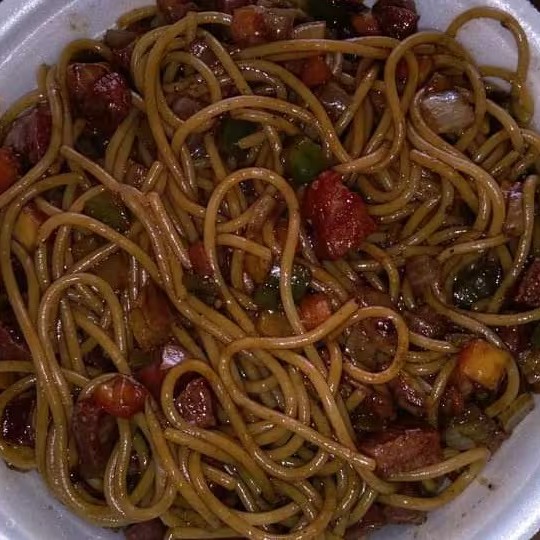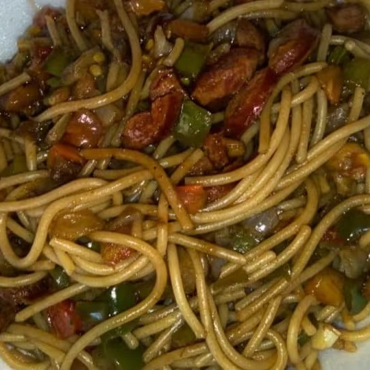 Macarrão tipo espaguete,linguiça calabresa,bacon,cebola,pimentão,tomate,molho shoyo,molho verde ,molho de alho e mussarela por cima.