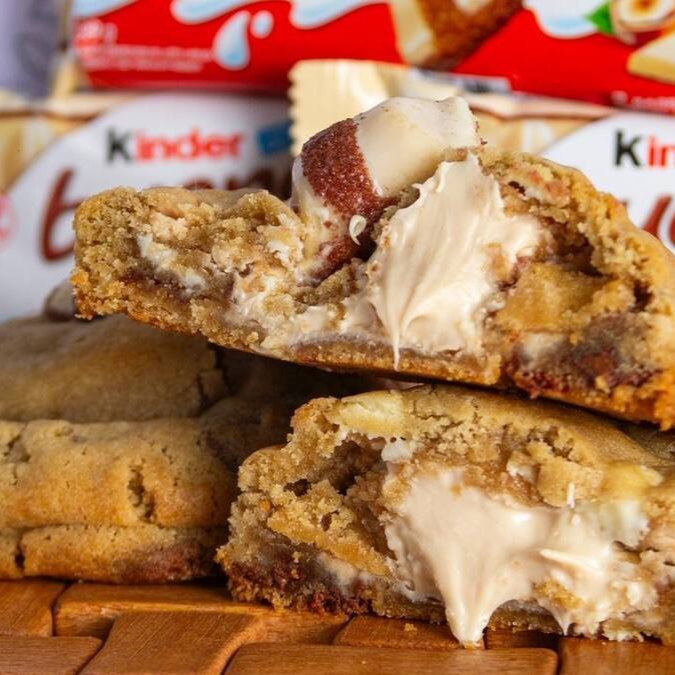 Massa duo (chocolate nobre branco e ao leite) com Kinder e o mesmo recheio do Kinder original.