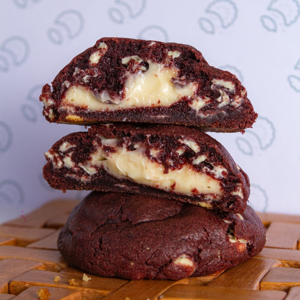 Massa red velvet com aquele toquezinho de baunilha, gotinhas de chocolate nobre branco e nosso incrível recheio de cream cheese.