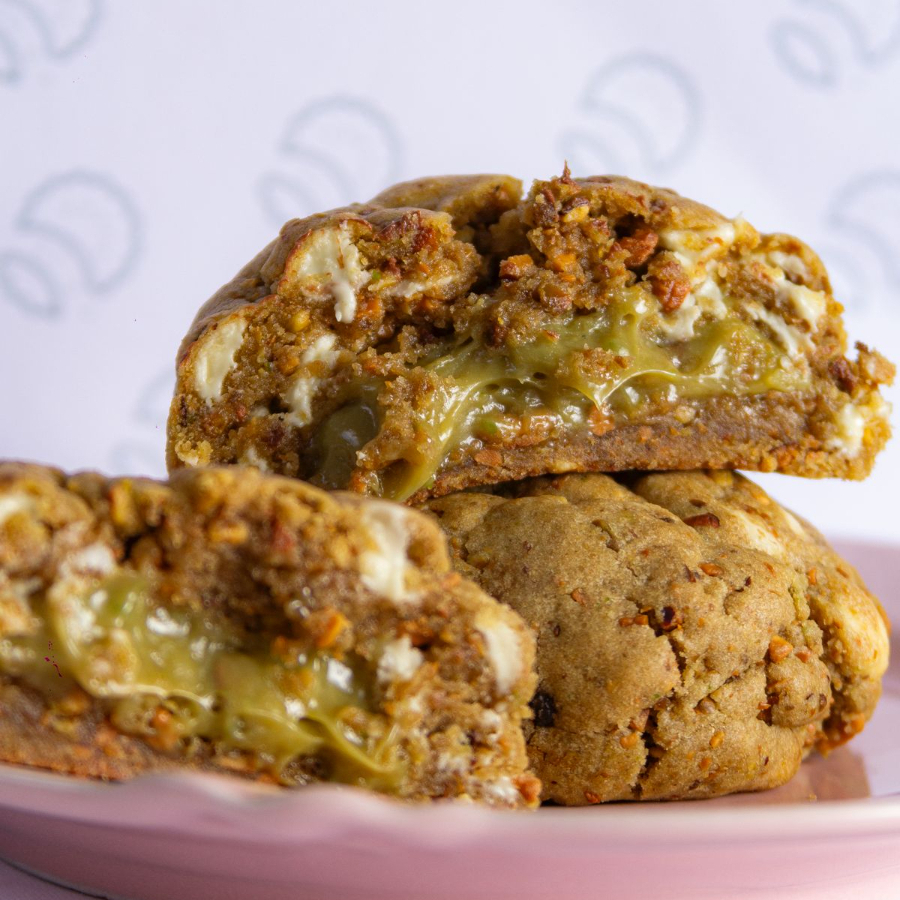 Massa deliciosa com gotas de chocolate nobre branco e pedaços de pistache com recheio do nosso brigadeiro artesanal de pistache.