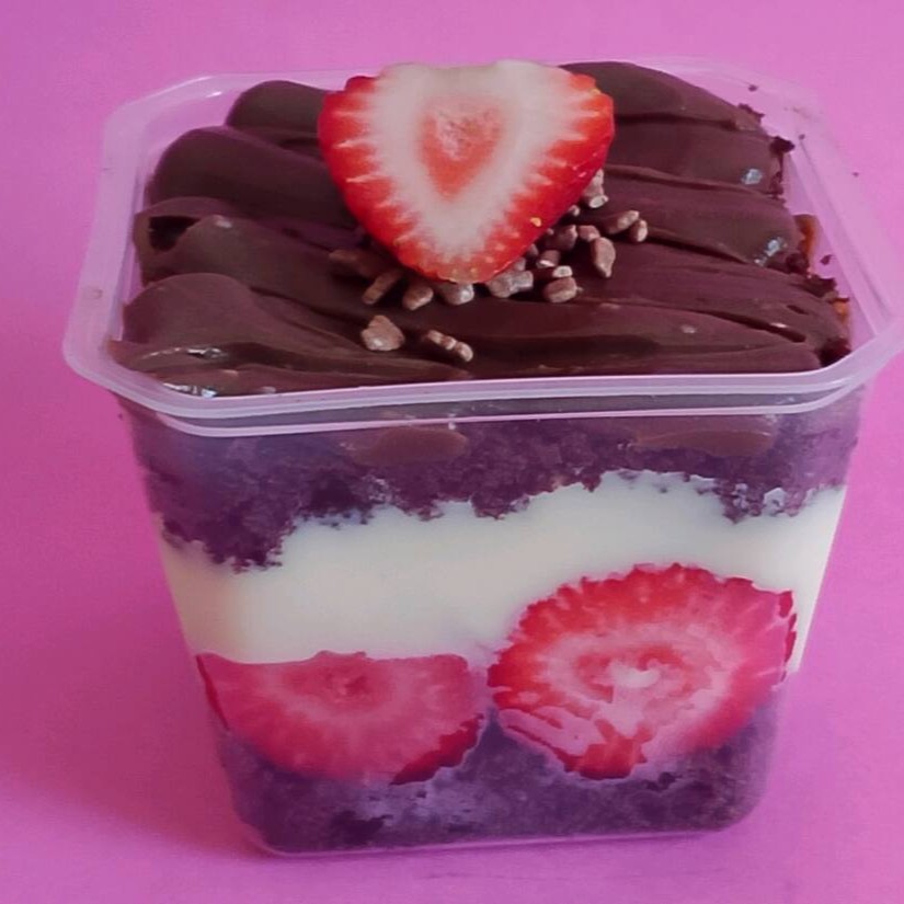 Bolo no pote com massa bem molhadinha e super fofinha de chocolate recheio de brigadeiro branco com morangos picados e chocolate.