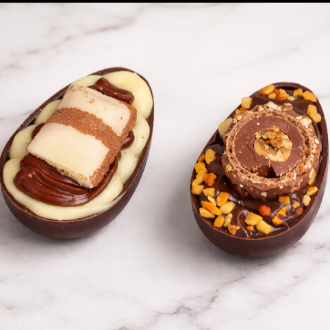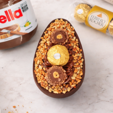 Dois dos sabores mais vendidos, casca de chocolate meio amargo um com recheio de Ferrero Rocher outro ninho com nuttela. Cada ovinho com 50g