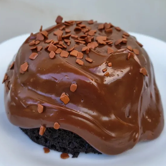 Mini bolo vulcão massa de chocolate 50% cacau bem molhadinha com cobertura de brigadeiro cremoso de ninho. Tamanho 12 cm