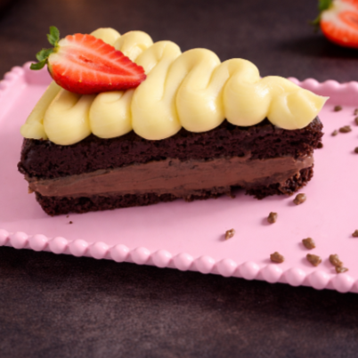 Nossa fatia de bolo dois amores com massa de chocolate 50% bem molhadinha, recheada de brigadeiro cremoso e finalizada com brigadeiro de ninho.
