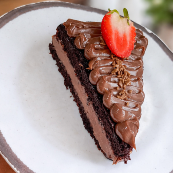 massa fofinha e úmida de chocolate, recheada e coberta com um delicioso brigadeiro cremoso feito com chocolate de qualidade. uma fatia generosa e iresistível, perfeita para matar sua vontade de doce