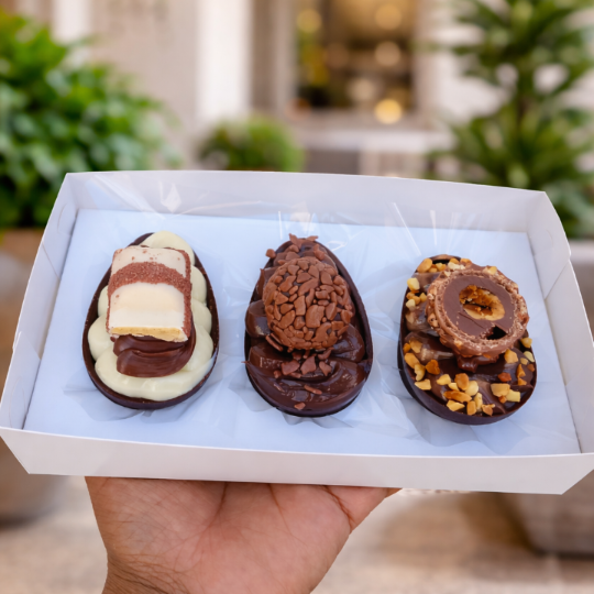 Trio degustação com os sabores mais pedidos Ferrero Rocher, brigadeiro e ninho com nuttela, perfeito para você degustar como também presentear alguém. Cada ovinho com peso de 50 g.