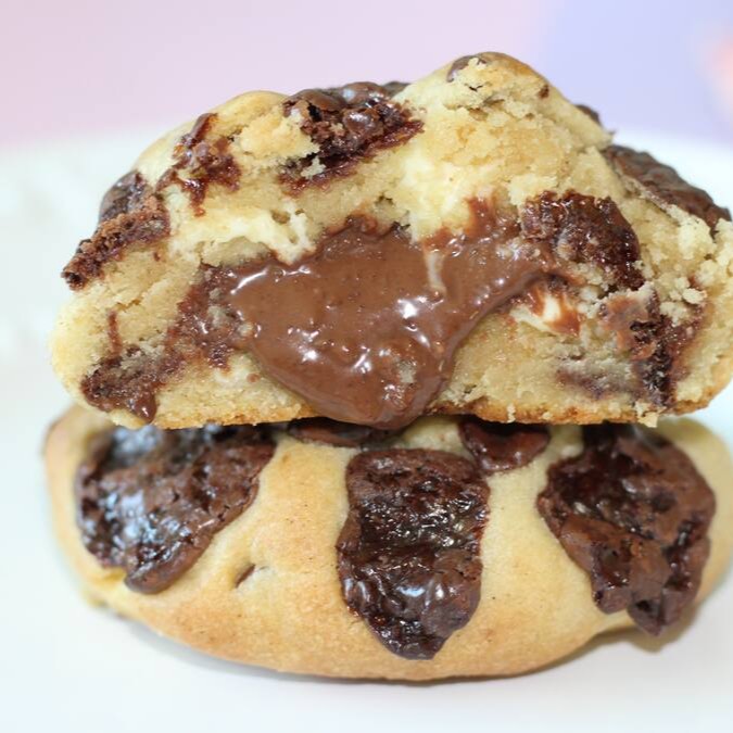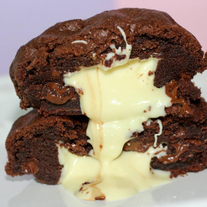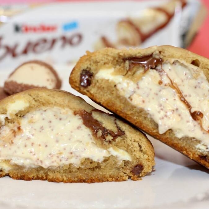 Cookie com massa branca e gotas de chocolate meio amargo e branco, com recheio artesanal de Kinder Bueno White. Peso aproximado de 100g. Serve uma pessoa.