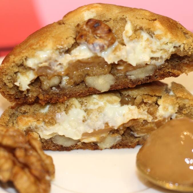 Cookie com massa red velvet e gotas de chocolate branco, recheado com um delicioso recheio cremoso de Leite Ninho e Nutella. Finalizado com um toque de Leite Ninho. Peso aproximado de 100g. Serve uma pessoa.