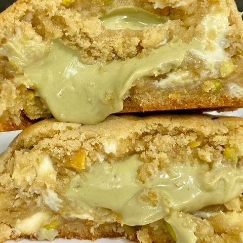 Cookie com massa contendo pedaços de pistache triturado e chocolate branco, recheado com uma deliciosa Ganache artesanal de pistache. Peso aproximado de 100g. Serve uma pessoa.