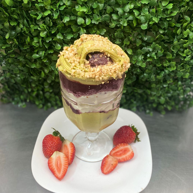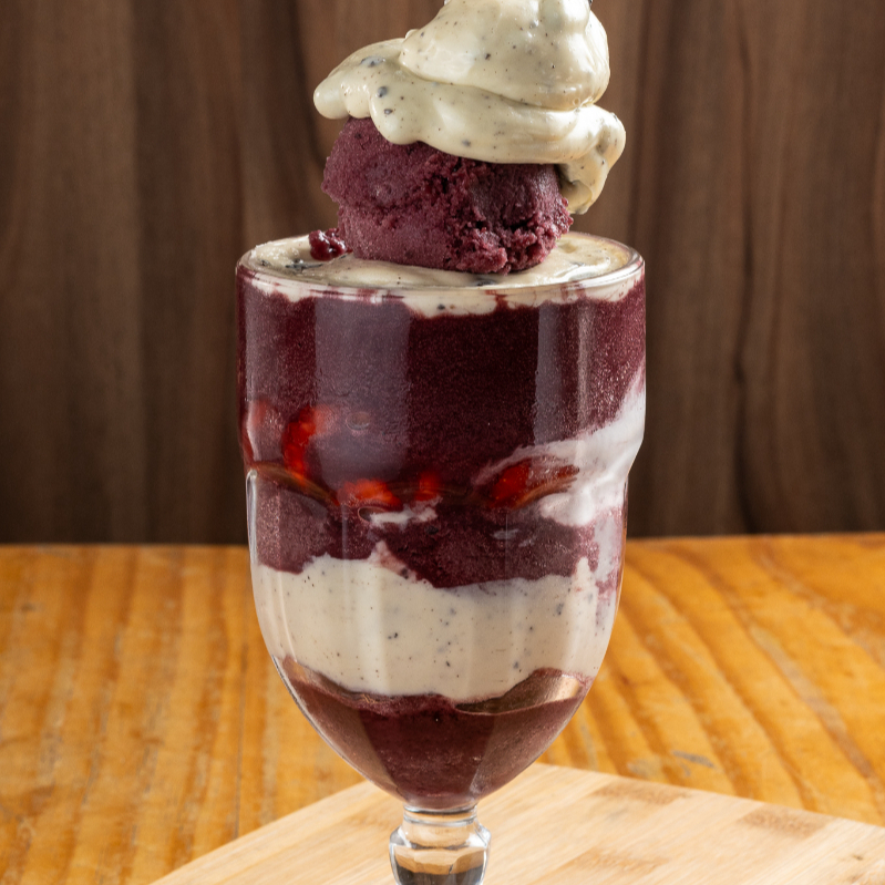 Açaí aerado, a cremosidade do creme de morango artesanal, toque clássico do leite em pó e finalizamos com morangos frescos e muita calda.