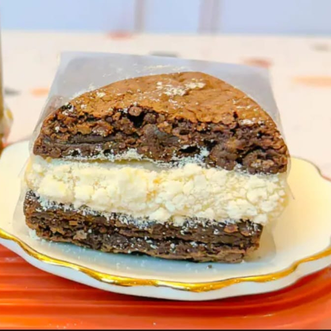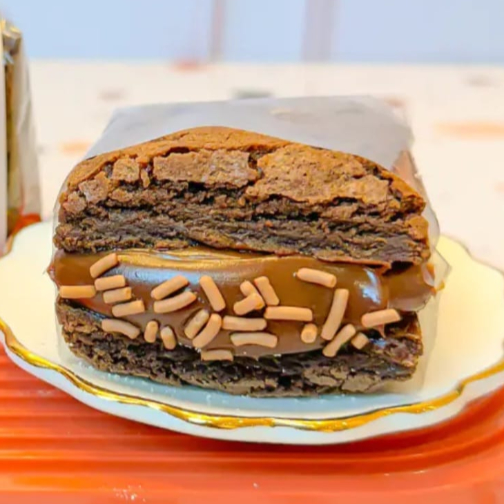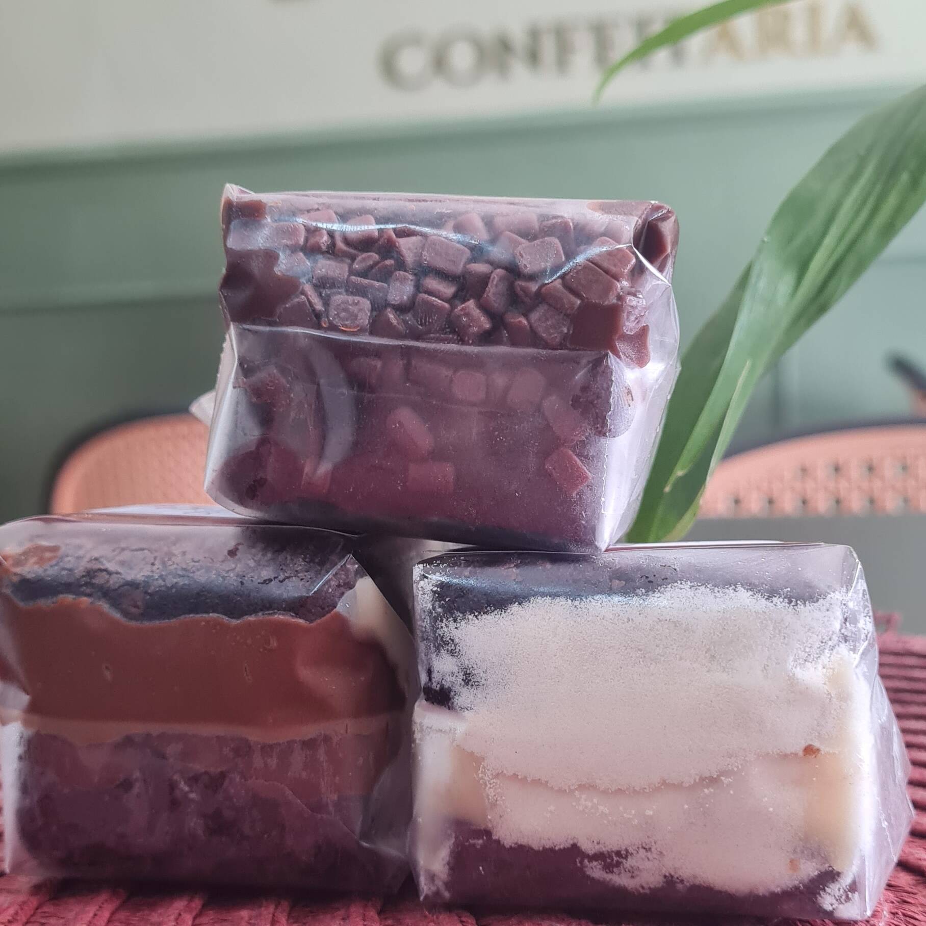 brownie bem chocolatudo que desmancha na boca,com uma textura bem molhadinha, recheado com brigadeiro de ninho (legítimo) bem cremoso. Aprox: 100g
