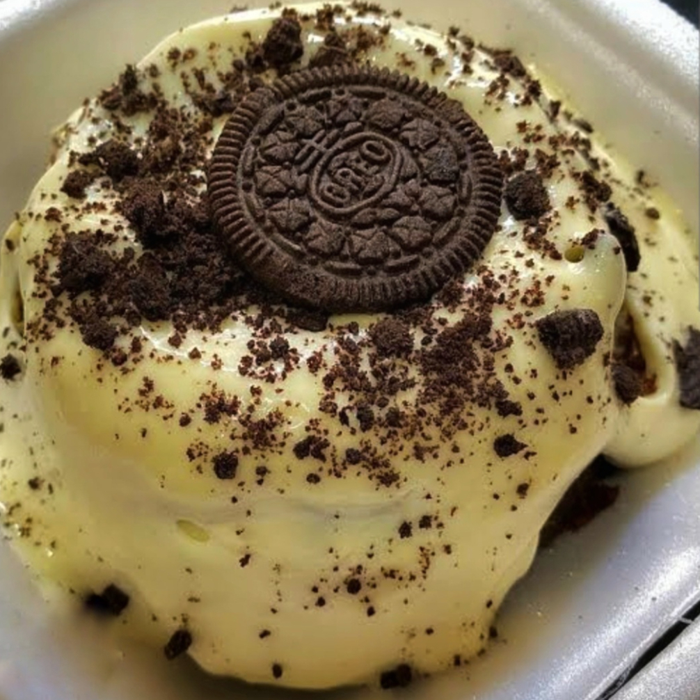 Massa de chocolate bem molhadinha com creme branco delicioso e pedaços de biscoito. finalizado com pedaços de biscoito e Oreo.