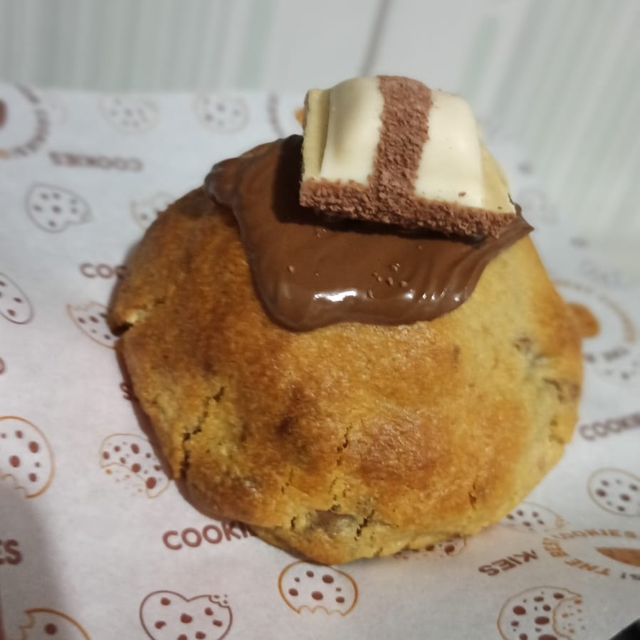 Massa artesanal de cookie deliciosa com gotas de chocolate nobre, recheada com creme kinder especial, finalizada com nutella e bombom kinder. 130g