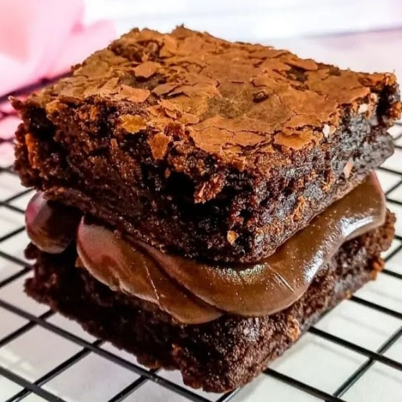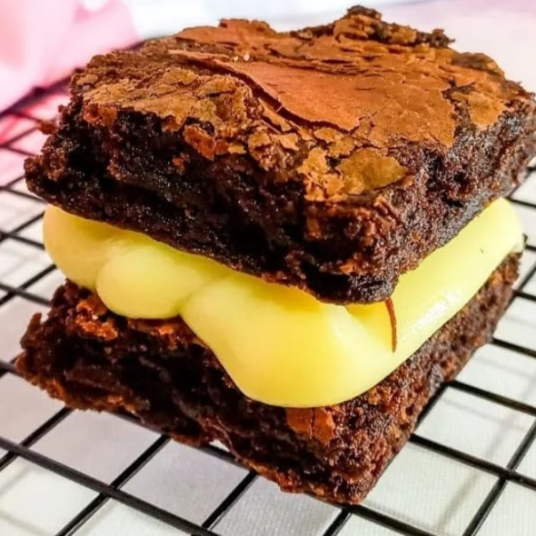 Dois quadrados de brownie 6x6cm molhadinho e com casquinha por fora, recheado com brigadeiro cremoso de Ninho. 150g