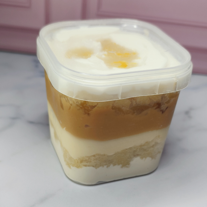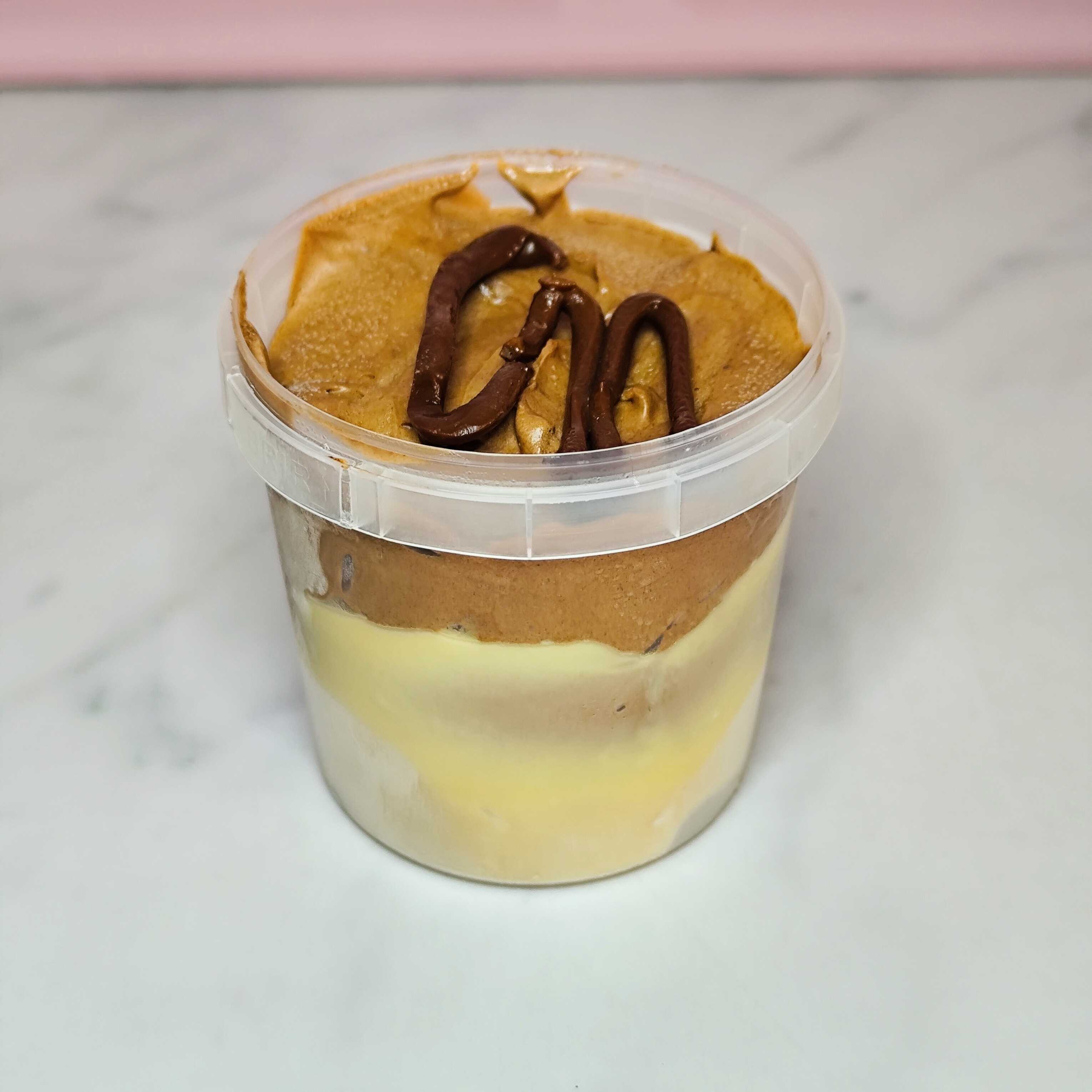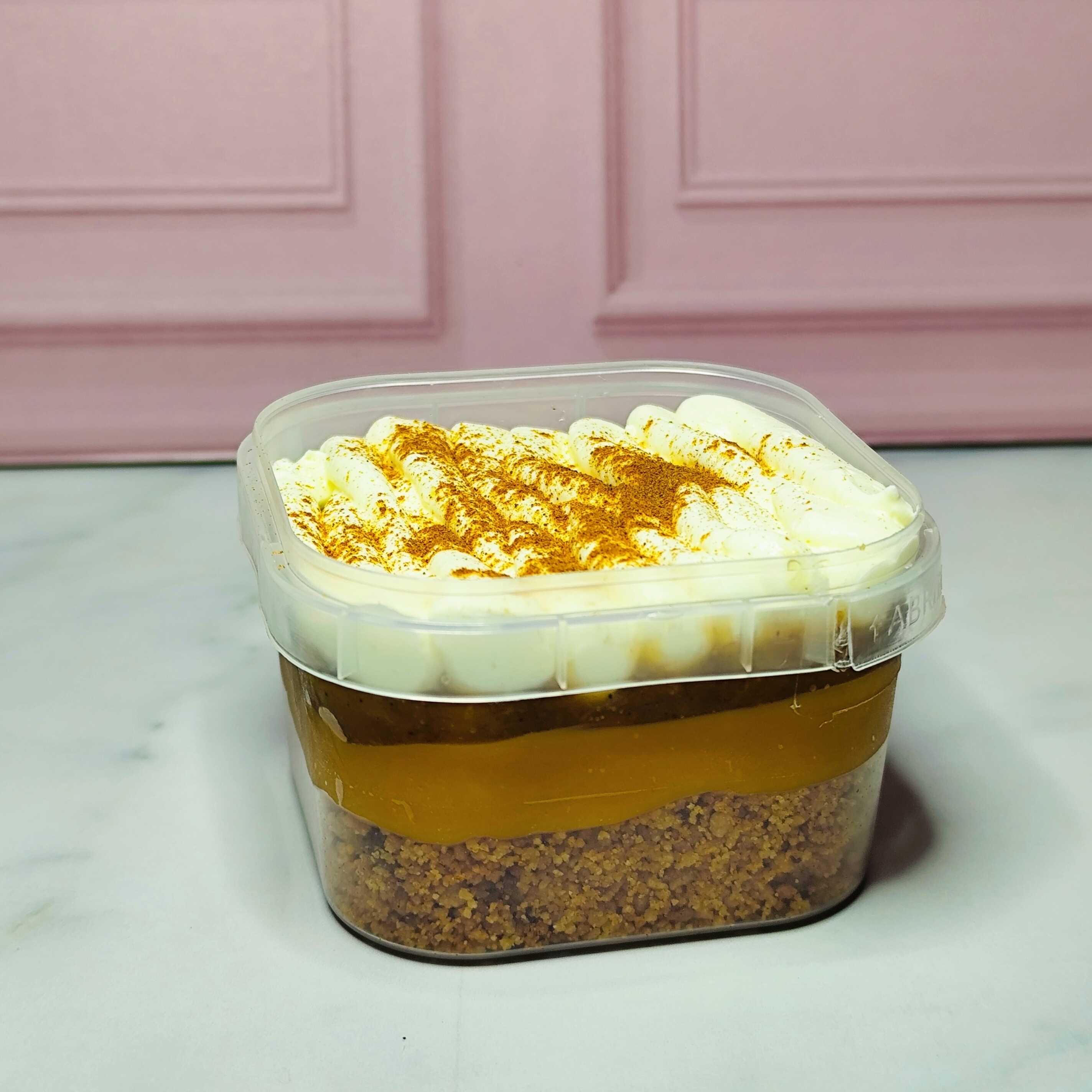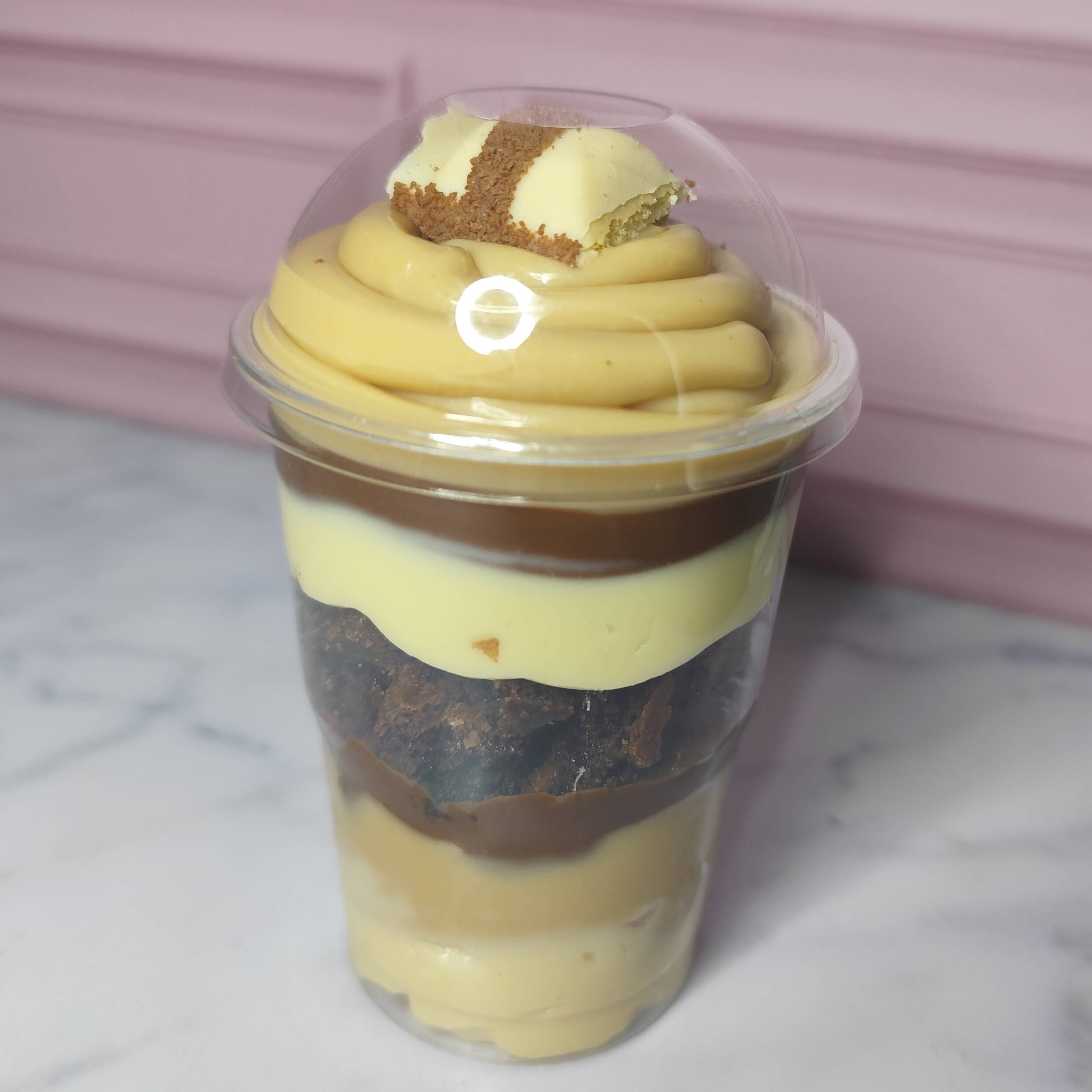 Camada de farofinha de biscoito caramelizada e crocante, camada de brigadeiro cremoso de doce de leite, camada de doce de banana caramelizado, camada de chantimousse de ninho e canela para finalizar. 180g