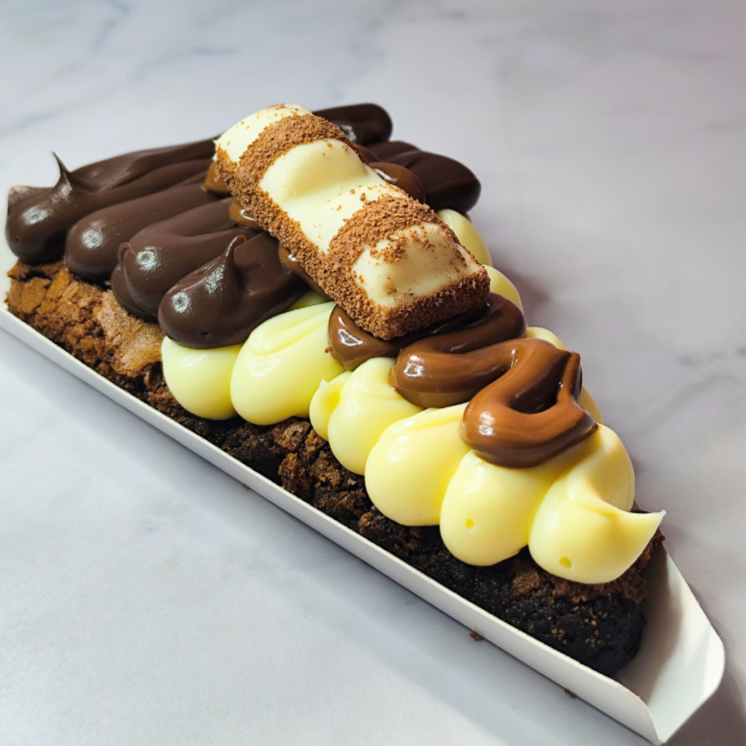 Dupla fatia de brownie, recheada com brigadeiro cremoso de Ninho e cobertura de brigadeiro cremoso de chocolate, finalizadas com granulado de chocolate nobre e brownie. 350g