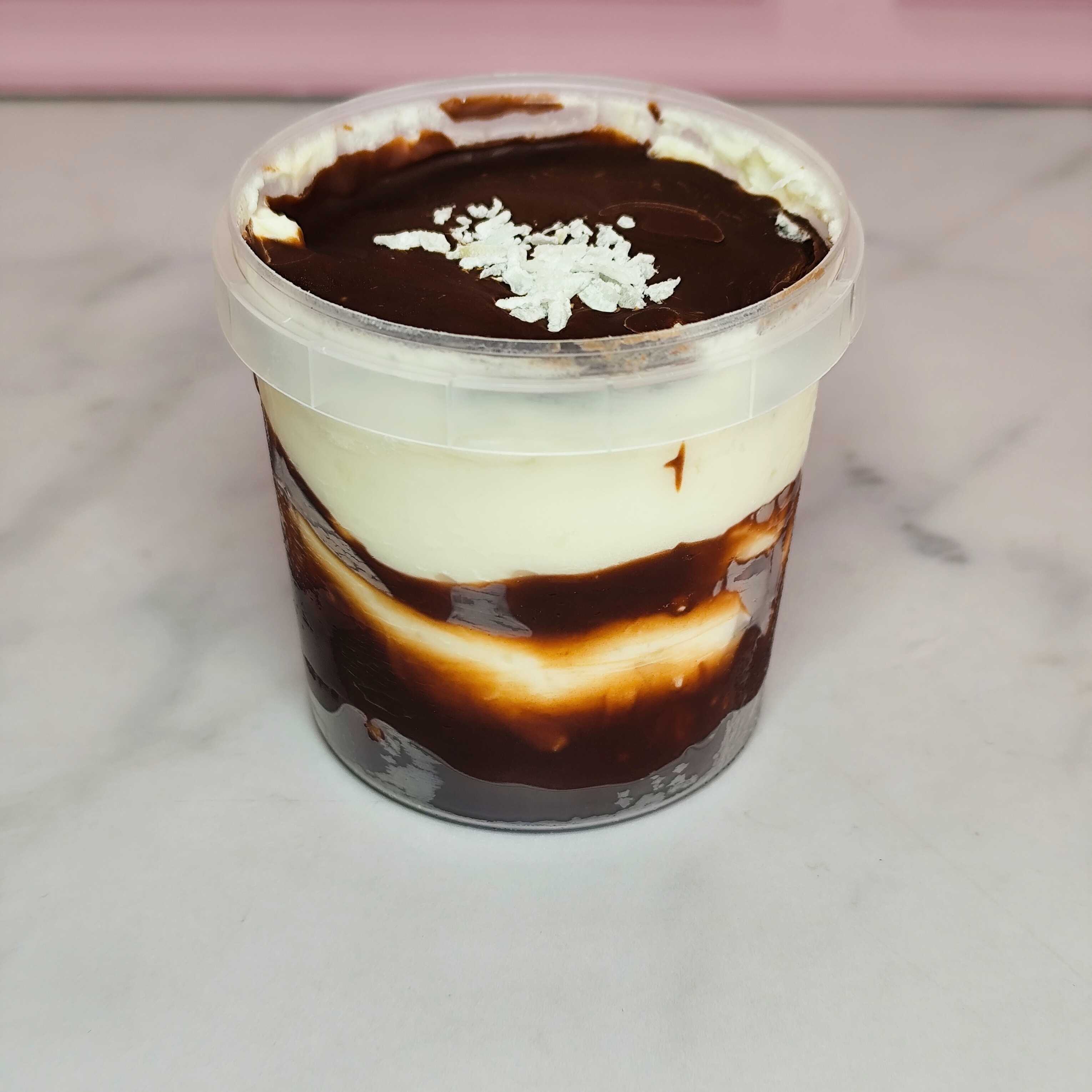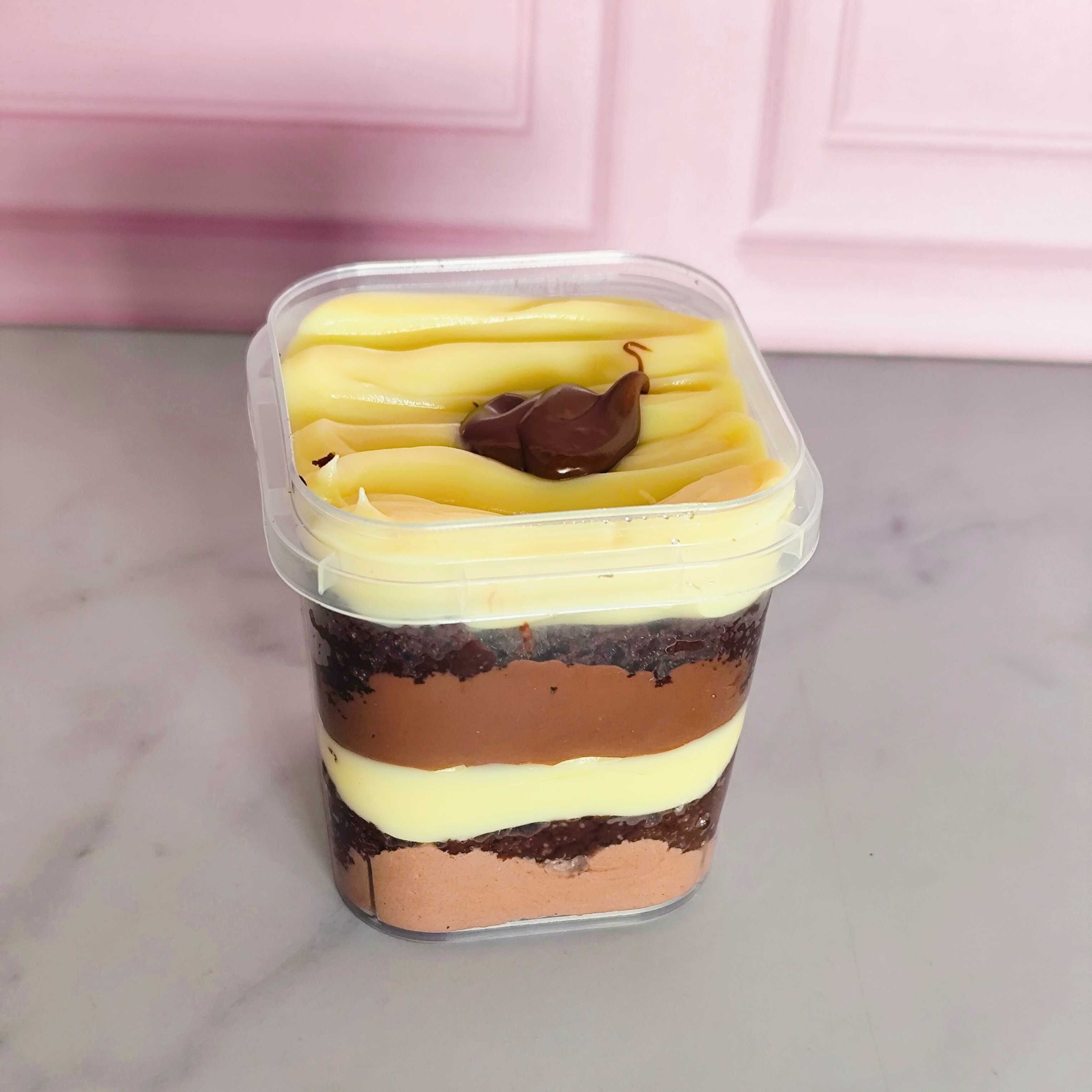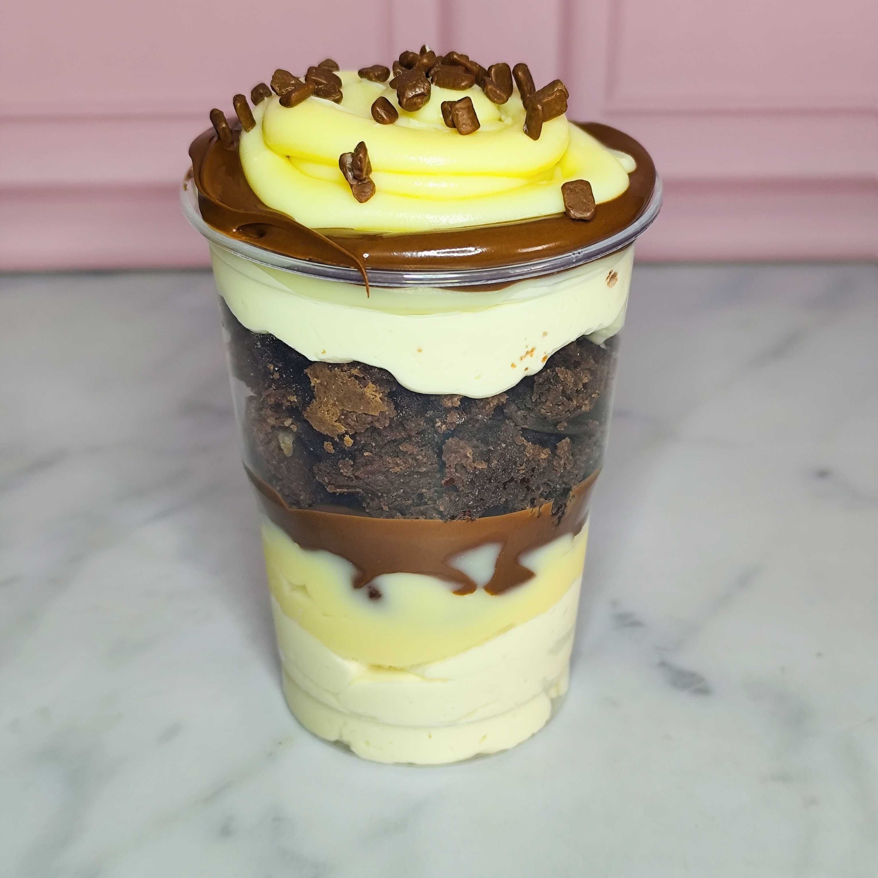 Dupla camada de massa de chocolate deliciosa, fofinha e bem molhadinha, camada de chantimousse de chocolate, dupla camada de brigadeiro cremoso de ninho, camada de nutella e finalizado com nutella. 230g.
