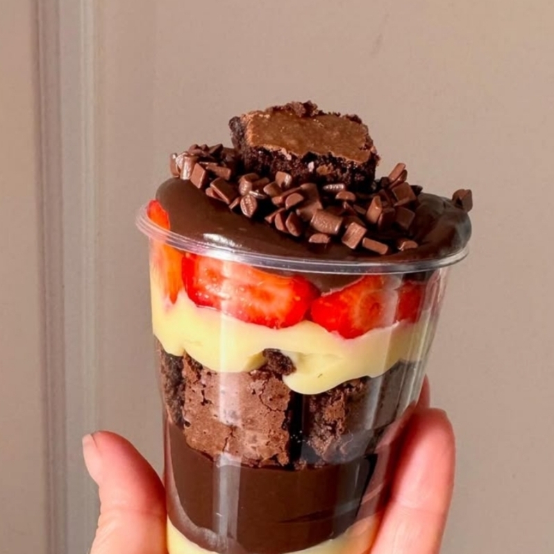 As camadas que encantam! Dupla camada de brigadeiro cremoso de Ninho, pedaços do nosso brownie molhadinho, dupla camada de brigadeiro cremoso de chocolate blend e camada de morangos picados, finalizado com morango. Delicioso!!! 200g