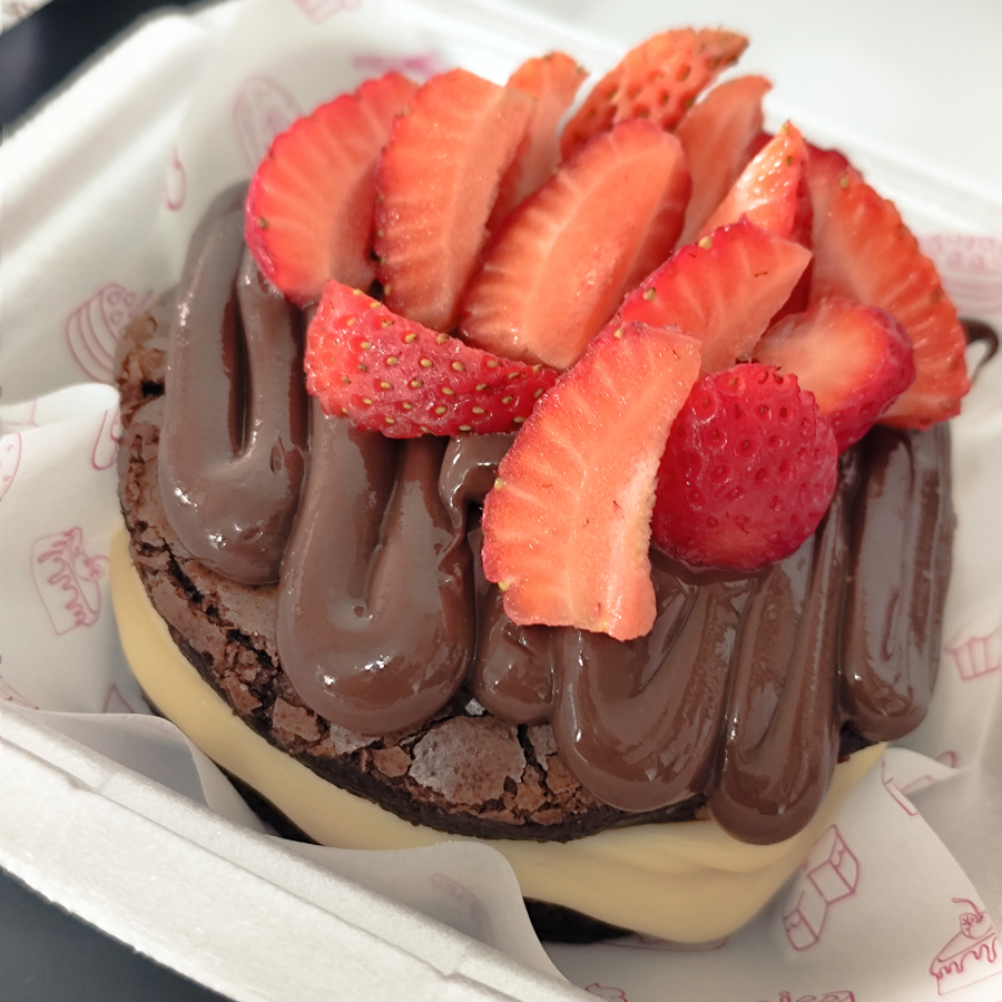 Fatia brownie molhadinha e com casquinha, coberta por brigadeiro cremoso de chocolate blend, finalizada com morangos. 200g
