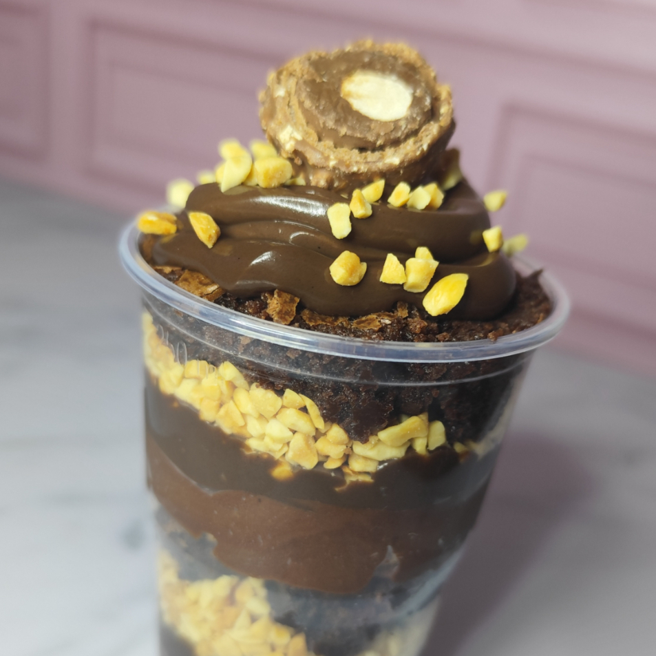 A felicidade desse copo é composta por dupla camada de mousse de chocolate blend, tripla camada de brigadeiro cremoso de chocolate 50% cacau, dupla camada de amendoim granulado, dupla camada de brownie molhadinho, camada de Nutella e metade bombom ferrero. 200g