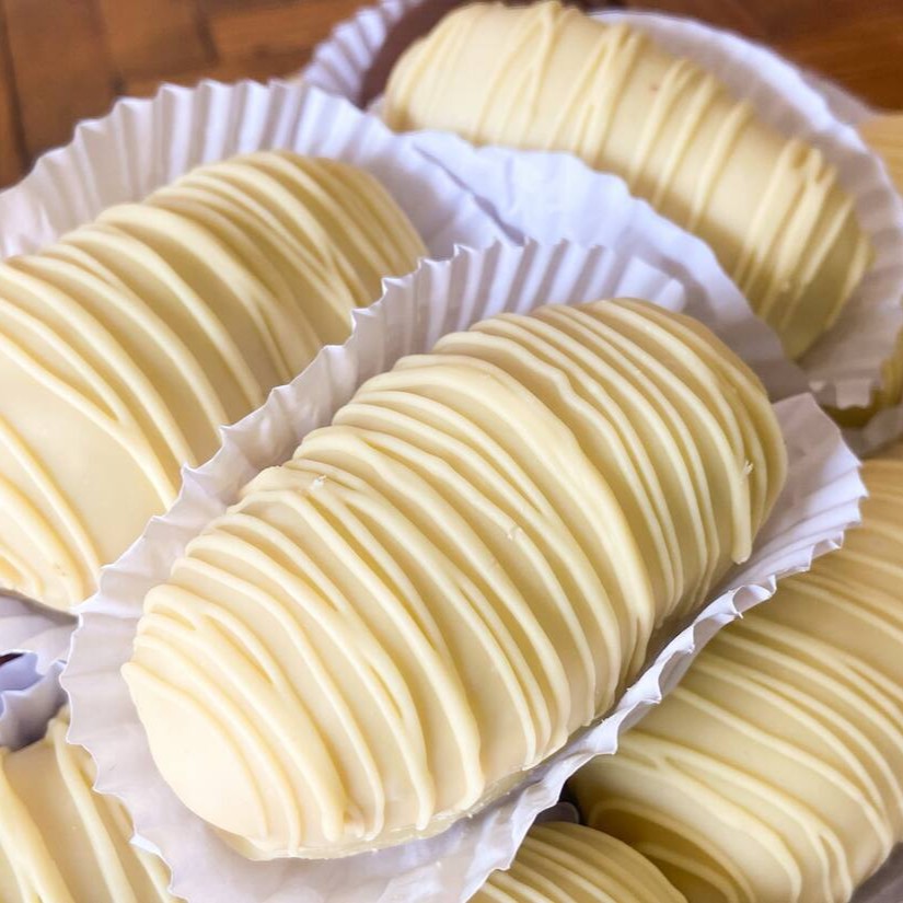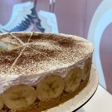 Base de biscoito, nosso incrível doce de leite, bananas, chantilly e chocolate polvilhado.