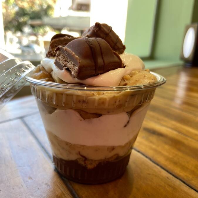 Copo com base de Ganache, Cookies, nosso incrível recheio de Kinder Bueno, nossa nhá benta de Ninho e Kinder para decorar.