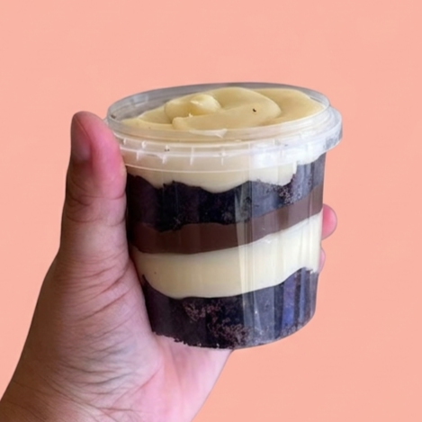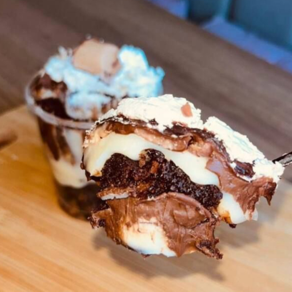 Irresistível Copo composto por camadas intercaladas de pedaços do nosso brownie bem chocolatudo, um delicioso Mousse de chocolate meio amargo, amendoim e a autentica Nutella. Peso Aproximado de 160g.