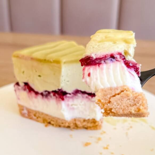 Maravilhosa fatia de torta, feita com uma base de biscoito amanteigada que derrete na boca, com uma generosa camada de nosso delicioso creme de chocolate branco, geleia de frutas vermelhas, creme de pistache e finalizada com uma ganache de pistache. Peso Aproximado de 150g.