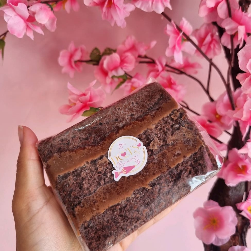 Fatia chocolatuda, massa bem molhadinha com um delicioso recheio de brigadeiro de chocolate cremodo.