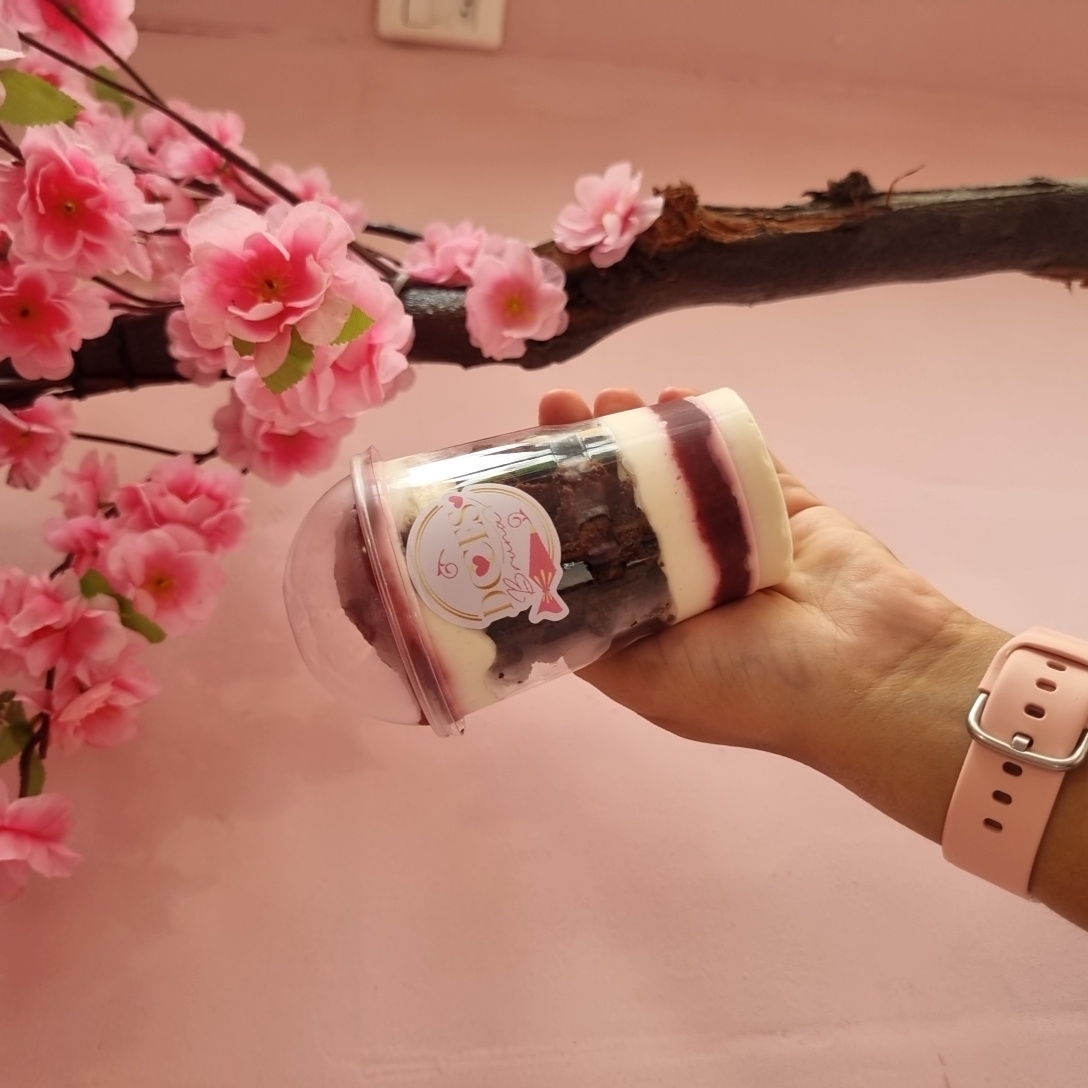Copo da felicidade com um delicioso mousse de Ninho com geleia de morango e brownie