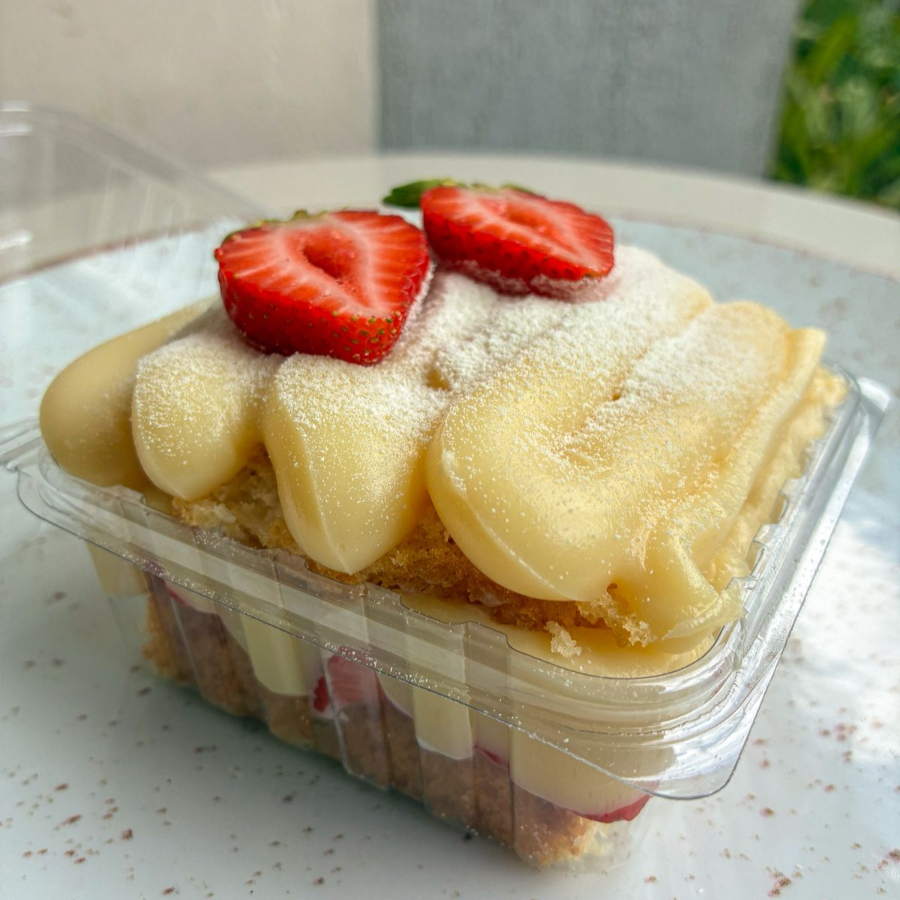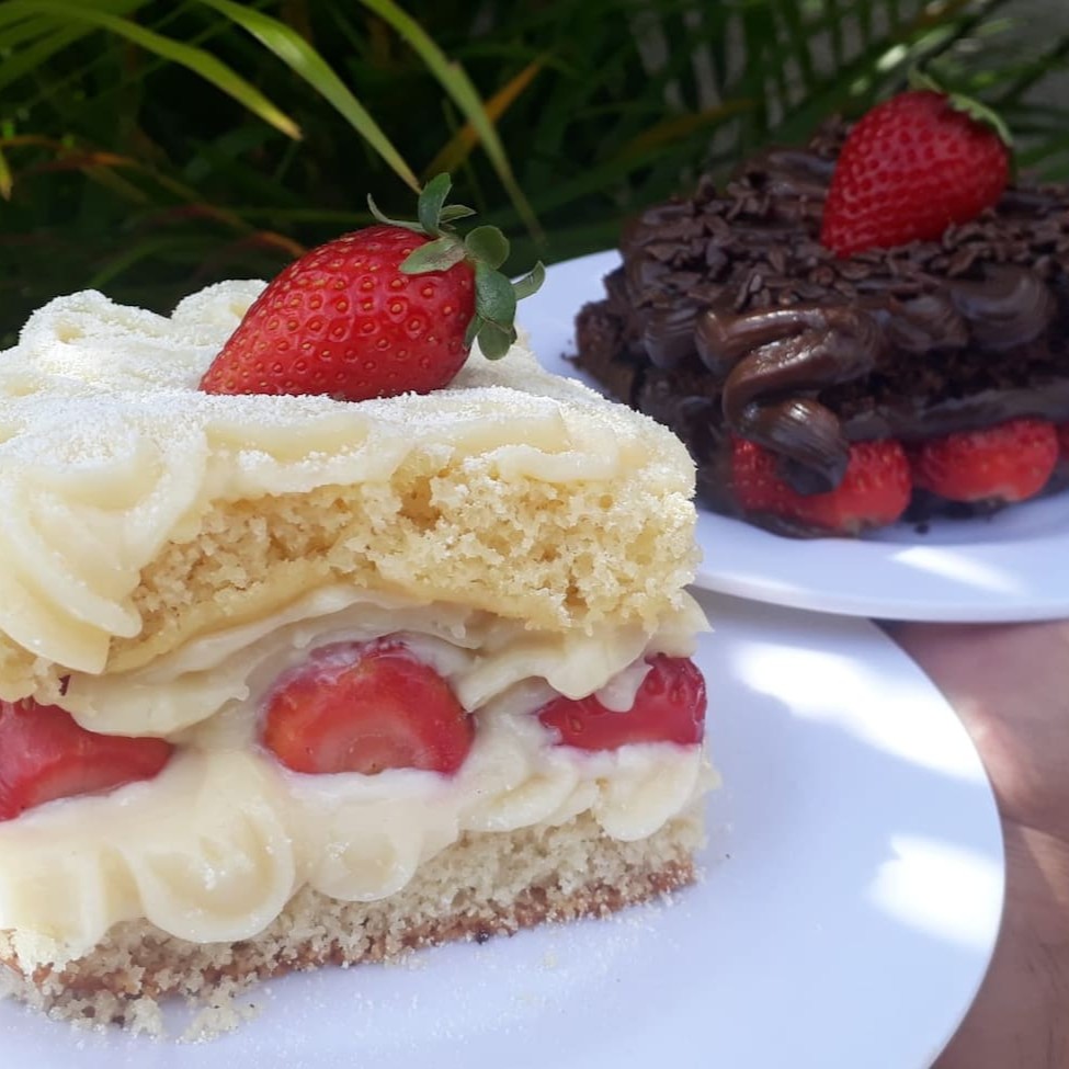 Fatia de bolo deliciosa, com massa de baunilha bem molhadinha, recheado com brigadeiro cremoso de Leite Ninho e morangos.