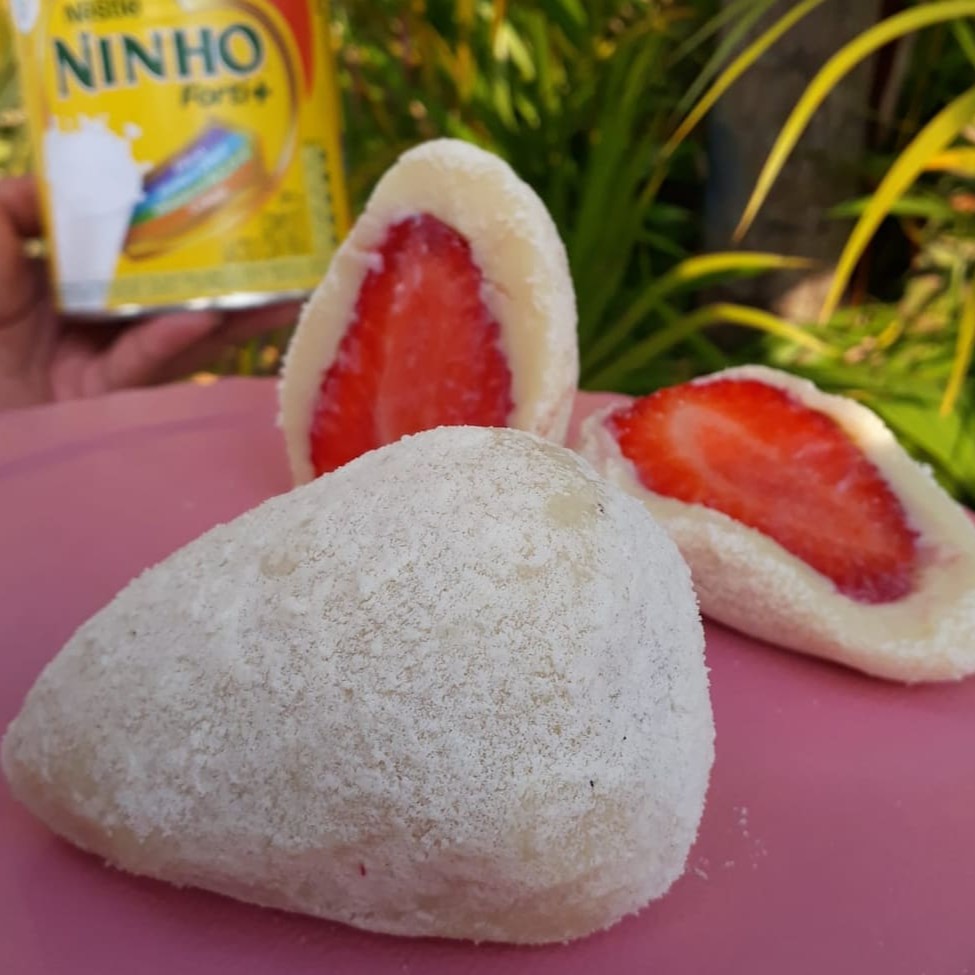 Coxinha preparada com o nosso maravilhoso brigadeiro de Leite Ninho, que derrete na boca de tão macio, recheada com um morango bem fresquinho e finalizada no leite em pó.