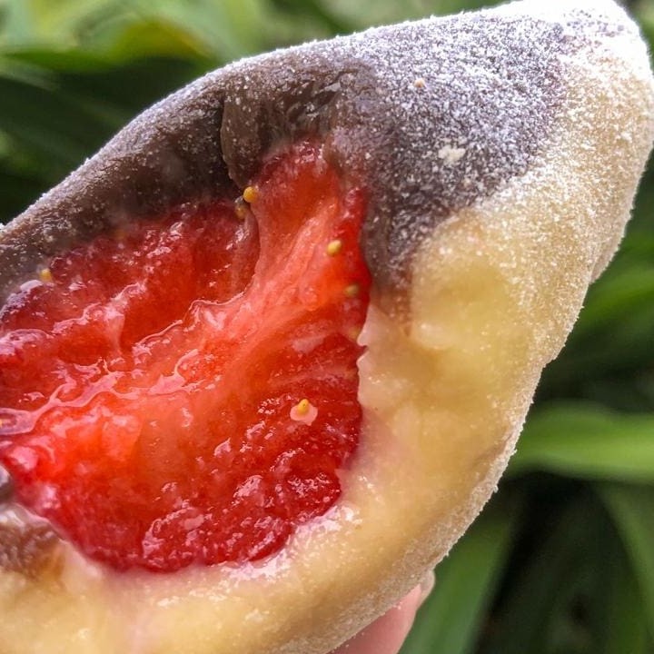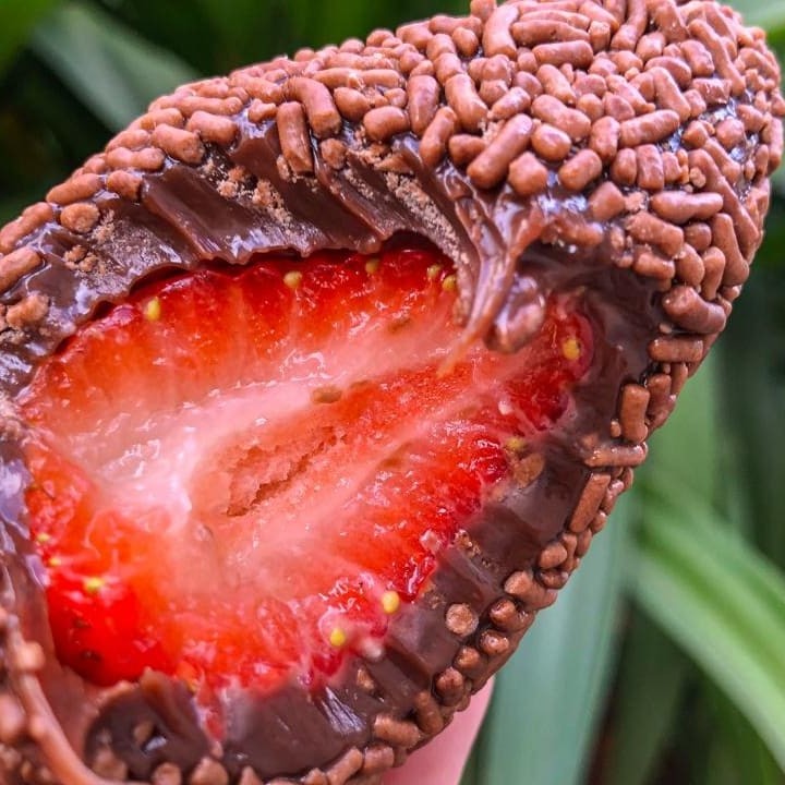 Coxinha preparada com o nosso maravilhoso brigadeiro de chocolate nobre, que derrete na boca de tão macio, recheada com um morango bem fresquinho e finalizada no granulado.