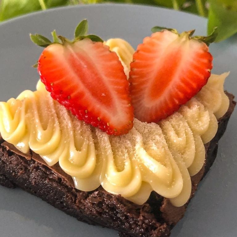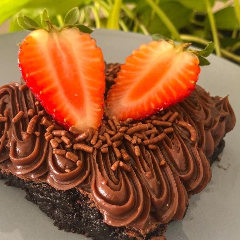 Nosso saboroso brownie com massa de chocolate nobre, bem molhadinha e casquinha crocante, morangos fresquinhos, cobertura do delicioso e cremoso brigadeiro de Leite Ninho, finalizado com granulado e morangos fresquinhos. Uma sobremesa que combina brownie, brigadeiro e morango é uma verdadeira explosão de sabores e texturas.