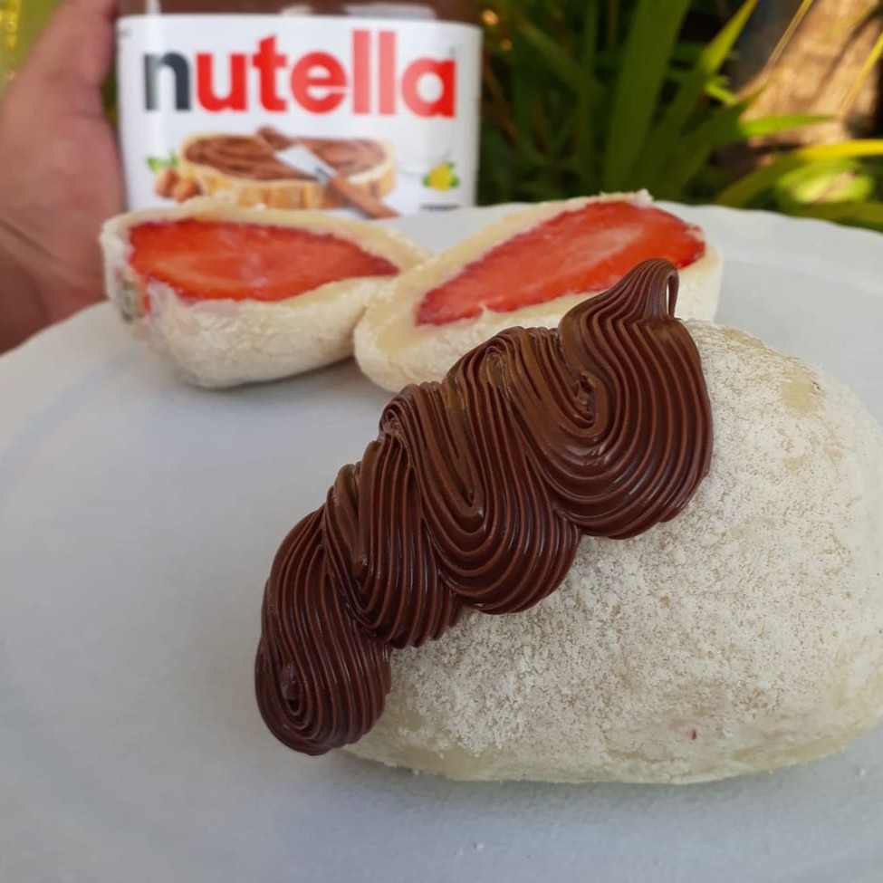 Coxinha preparada com o nosso maravilhoso brigadeiro de Leite Ninho, que derrete na boca de tão macio, recheada com um morango bem fresquinho e finalizada no leite em pó e muuuuuuita Nutella.