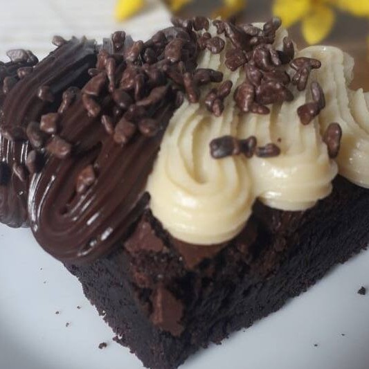 Um saboroso brownie de chocolate nobre, bem molhadinho e casquinha crocante. De cobertura deliciosos e cremosos brigadeiros de chocolate branco e chocolate ao leite.