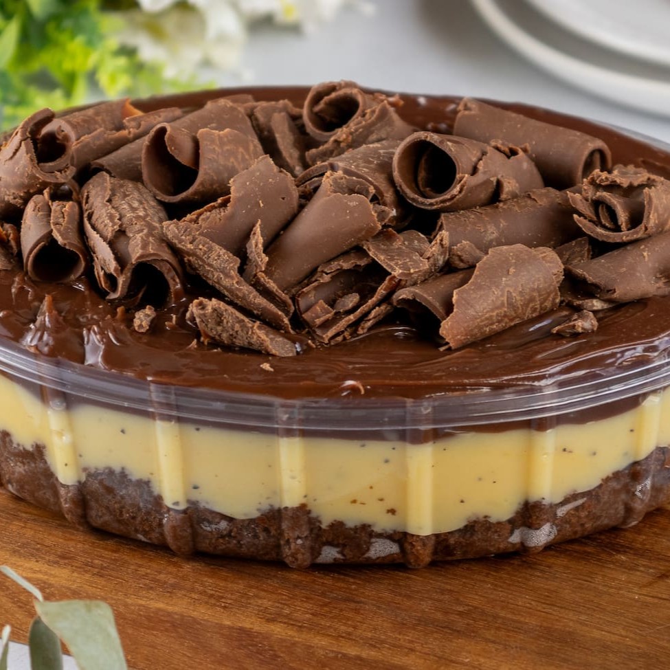 A combinação perfeita entre o azedinho da fruta e o sabor intenso do chocolate ao leite. Nossa Torta de Chocolate e Maracujá na travessa é feita com camadas de bolo de chocolate bem molhadinho, um creme de maracujá feito com redução da polpa da fruta, brigadeiro de chocolate ao leite e finalizada com delicadas raspas de chocolate.
