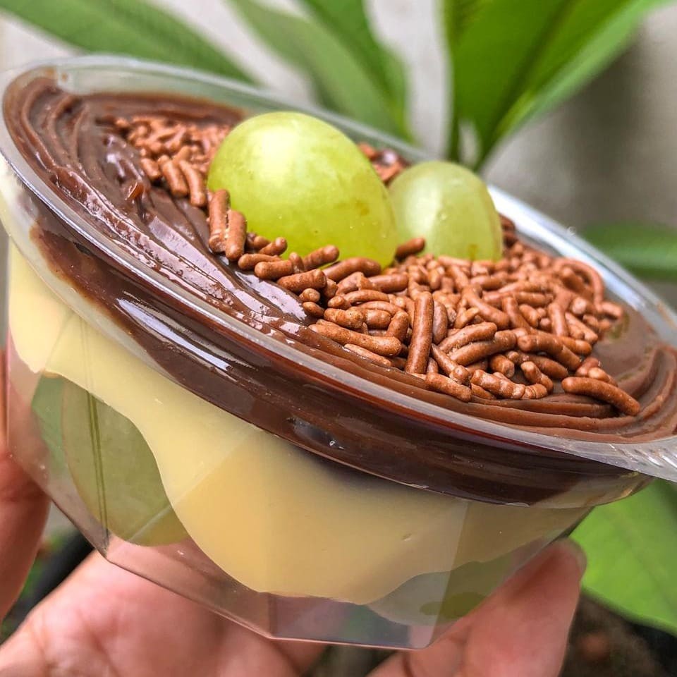 Saboroso bombom aberto de uvas verdes sem semente, brigadeiro cremoso de Leite Ninho e brigadeiro cremoso de chocolate ao leite, finalizado com granulado e uvas fresquinhas.