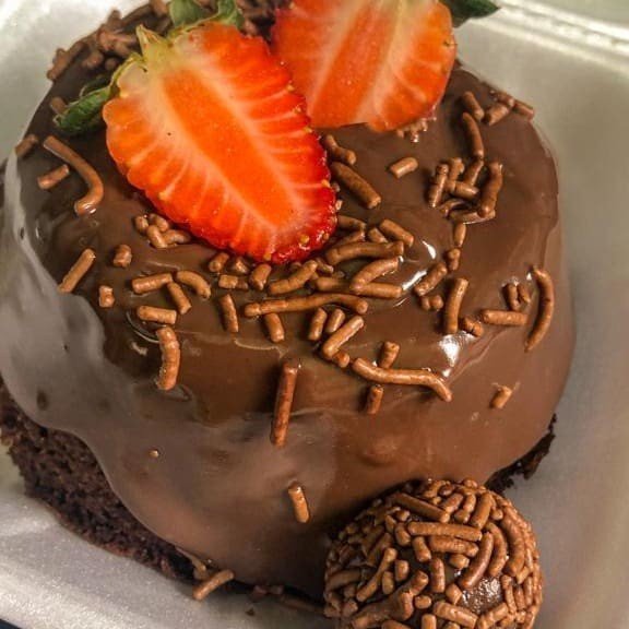 Delicioso mini bolo vulcão de massa caseira de chocolate, bem fofinho, recheado com morangos bem fresquinhos, cobertura de brigadeiro cremoso de chocolate nobre finalizado com granulado. Atenção: Porção Individual Aproximadamente 250g.