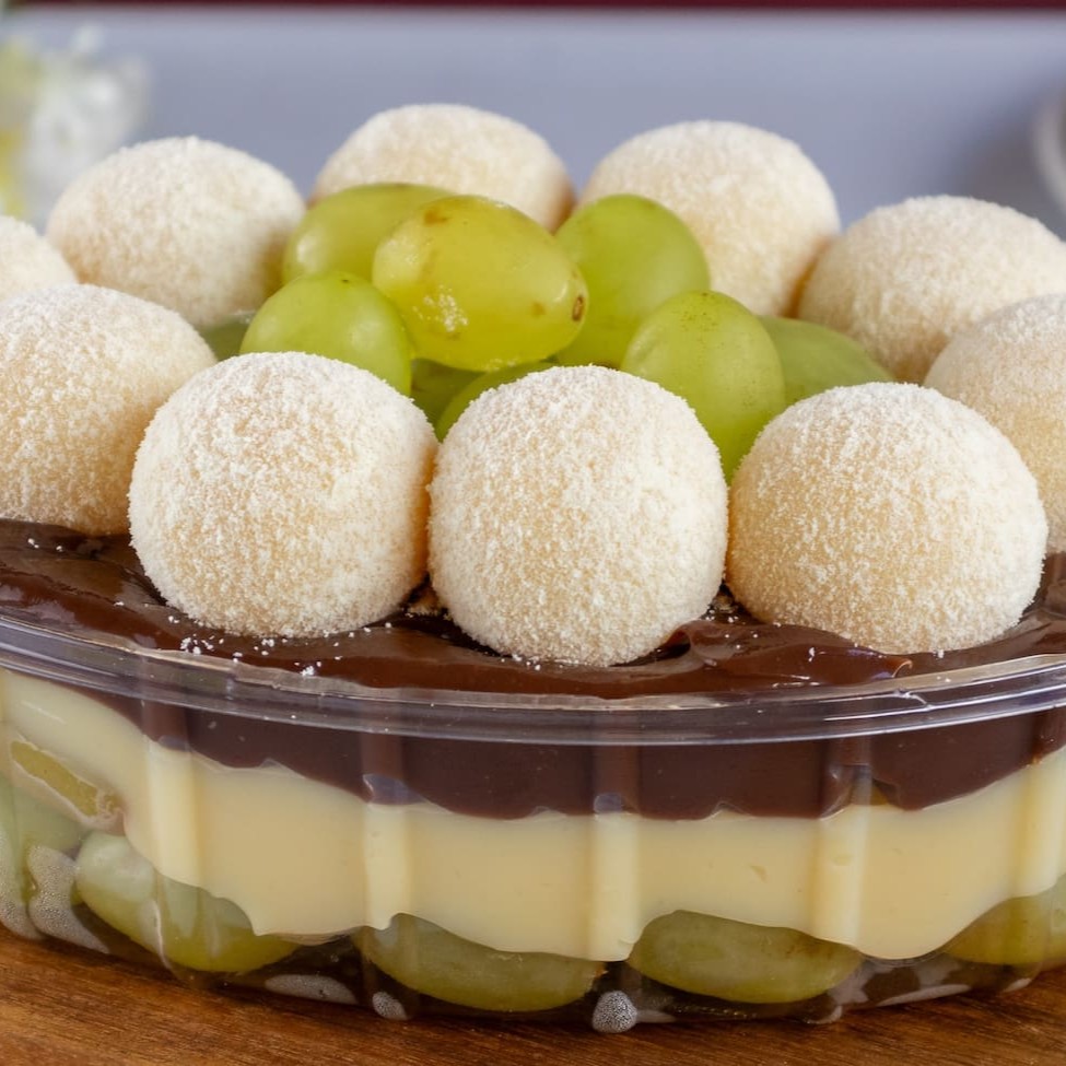Nosso Bombom Aberto de Uva Verde na travessa é feito na hora, com uvas verdes selecionadas, creme moça e brigadeiro de chocolate ao leite. Decorada com brigadeiros de Leite Ninho e uvas frescas, é uma combinação perfeita que vai te surpreender. Uma versão tamanho família das nossas sobremesas mais pedidas. Ideal para o almoço de domingo, confraternizações, dias especiais que merecem a melhor sobremesa.