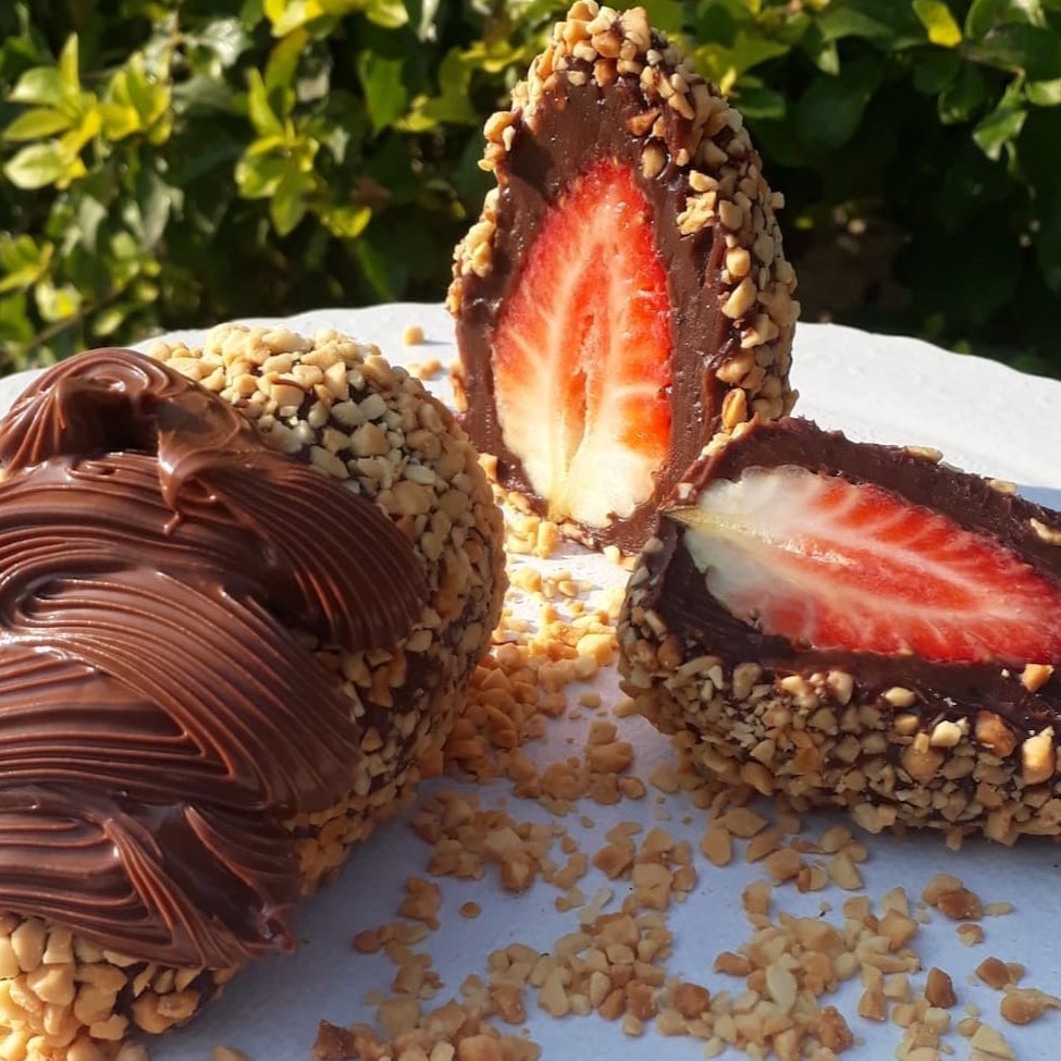 Coxinha preparada com o nosso maravilhoso brigadeiro de chocolate nobre, que derrete na boca de tão macio, recheada com um morango bem fresquinho e finalizada no amendoim triturado e muuuuuuita Nutella.