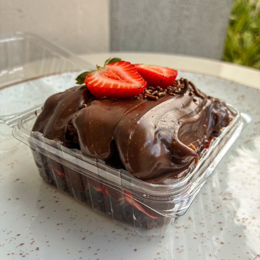 Fatia de bolo deliciosa, com massa de chocolate bem molhadinha, recheado com brigadeiro cremoso de chocolate nobre e morangos.