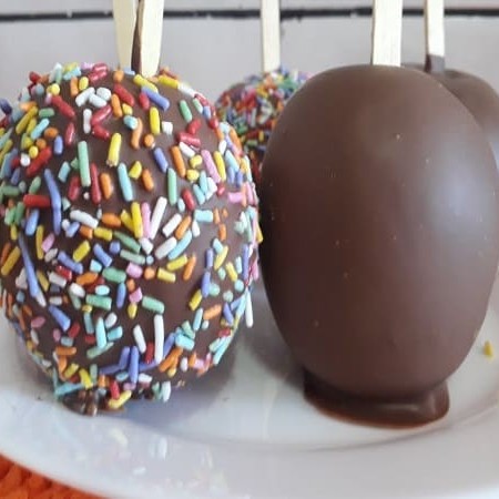 Espeto 20 cm com 4 unidades de machimelo glacado na hora com chocolate ao leite